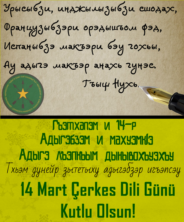 Ghısh Nuh Гъатхэпэм и 14-м Адыгэбзэм и махуэмкӏэ Адыгэ лъэпкъым дынывохъуэхъу! Тхьэм дунейр зытетыху адыгэбзэр игъэпсэу!.. Адыгэ Хэку Зыгухьэныгъэ 14 Mart Çerkes Dili günümüz Kutlu olsun! Dünya Var oldukça Allah dilimizi yaşatsın!..