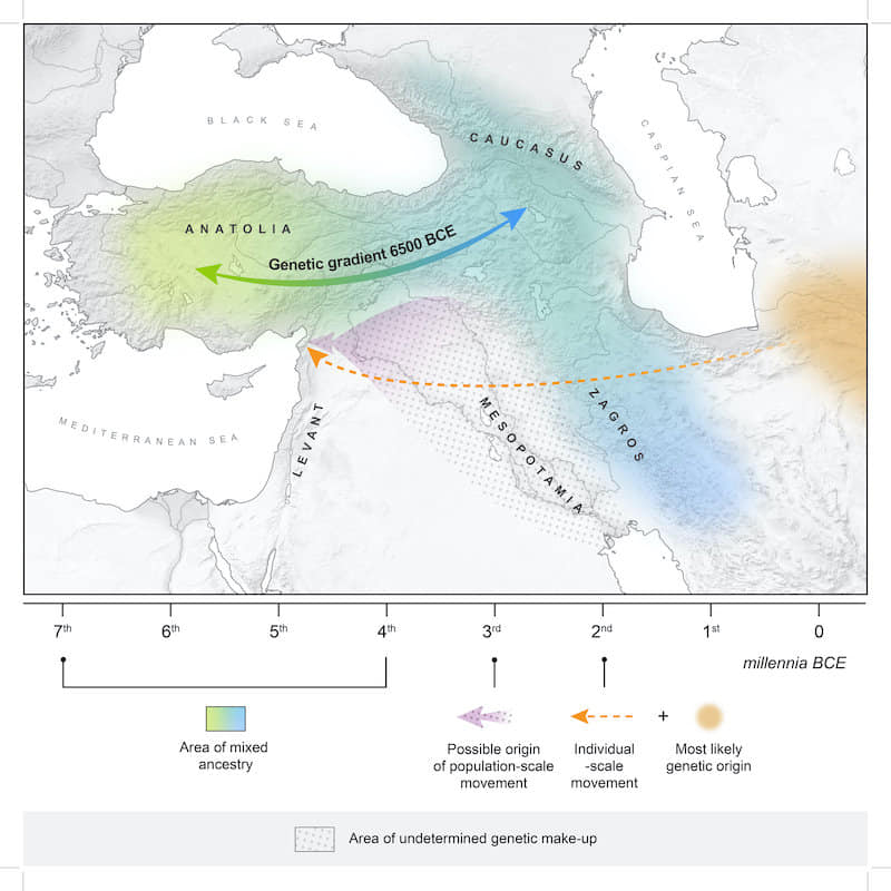 Uluslararası bir araştırma ekibi, Anadolu ve Kafkasya nüfusunun MÖ 6.500 dolaylarında genetik olarak karıştığını ve 4.000 yıl önce Mezopotamya’dan küçük göç olaylarının da bölgenin genetik olarak karışmasına yol açtığını gösteriyor.