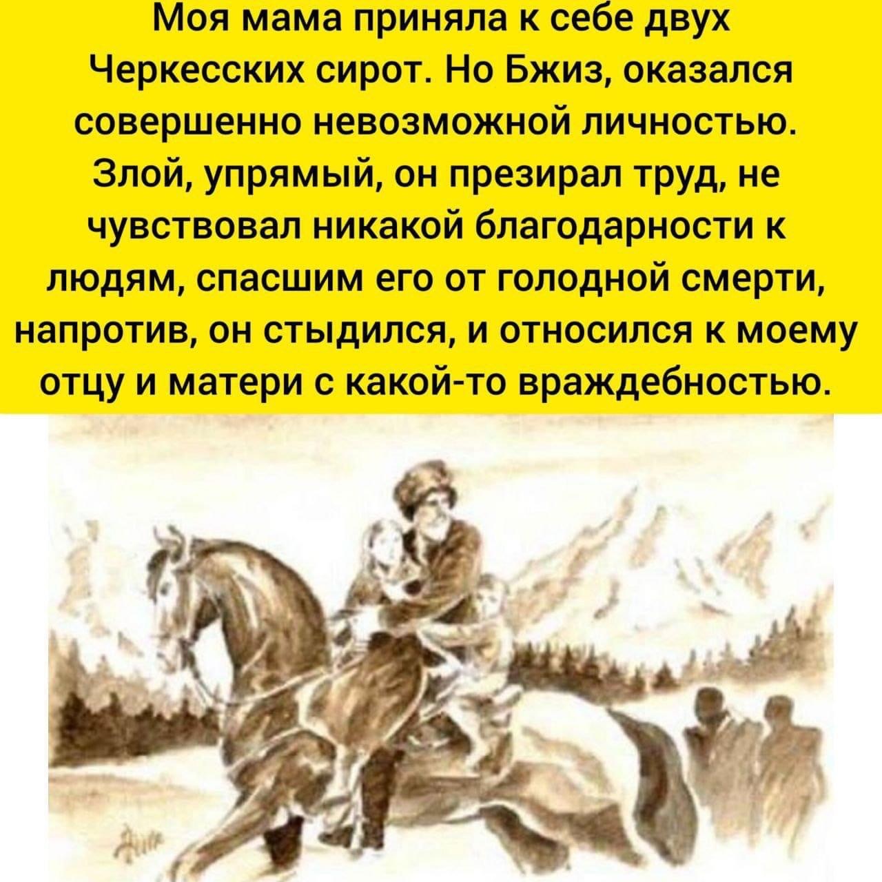 Annem iki Çerkes yetimini yanına aldı; Kafeza isimli bir kızı ve Bjiz isimli bir genci. İkisini de vaftiz etti. Kafeza büyüdüğünde son derece güzel bir kız oldu. Uysal, mütevazı, itaatkardı. Novorossiysk'e yerleşen bir askerle evlendi ve hatırladığım kadarıyla mütevazı bir kaderi oldu.