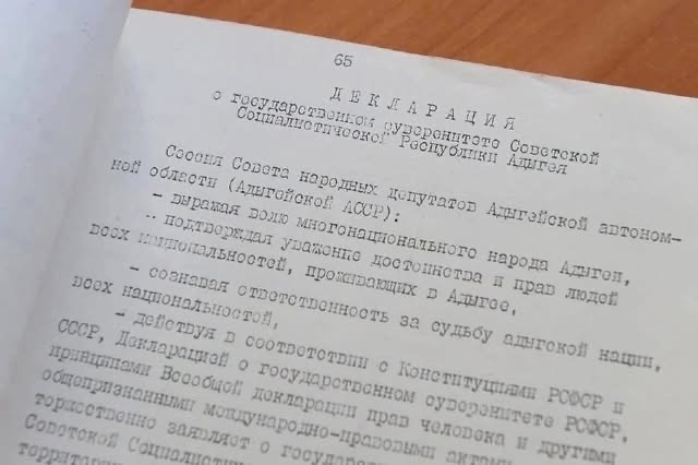 28 Haziran 1991'de Sovyet Sosyalist Adığe Cumhuriyeti, Egemenlik Bildirgesini imzalandı. Egemenlik Bildirgesi, Adığe Cumhuriyeti'nin yenilenen Rusya'daki yerini ve rolünü tanımlayan yasal bir belgedir.