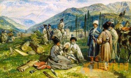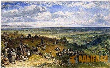 WILYAM SİMPSON'IN ÇERKESYA İZLENİMLERİ (www.adygi.ru) Ocak 1855'te İngiletere'deki Lord Aberdeen hükümetinin düşmesinden ve görevinden istifa etmesinden sonra, Newcastle Dükü ordunun durumunu, arazinin doğasını ve Çerkesya'daki durumu incelemek için Karadeniz ve Kırım'ı gezdi. Bilinmeyen topraklara yapılan yolculuk, Wilyam Simpson'un ilgisini çekti. Sanatçı, otobiyografisinde Kırım Savaşı'ndan önce Çerkesya'yı ziyaret eden İngilizlerin bir elin parmaklarıyla sayılabileceğini yazıyor. Wilyam Simpson'a Çerkesya seyahatinde Newcastle'a eşlik etmesi ve bir dizi çizim yapması istendi. Kafkas halklarının birçok dilini bilen Lucca Dükünün hizmetçisi, yazar Lawrence Oliphant ve denizcilik sanatçısı Oswald Brierly'nin bulunduğu heyet 29 Eylül 1855'te yola çıktı. Gezginlere, büyük bir vatansever Çerkes grubu eşlik ediyordu ve Çerkeslerin de eşlik ettiği grup 3 Ekim'de Anapa'ya vardı. Burada, İngilizlere kararlılıklarını ve cesaretlerini göstermek için, Çerkesler Rus kalesine saldırdılar. Bu savaştan sonra, W. Simpson, kaba bir bıçak yardımıyla yaralı bir adamın vücudundan mermi çıkarmak için yapılan cerrahi operasyon ile yaralı adamın ölümcül yarasına rağmen gülümsemesi ve sakince başkalarıyla konuşmaya devam etmesinden çok etkilendi. Simpson, bu durumun nedeninin ne olduğunu sorduğunda, savaşçının herhangi bir şekilde inlemesi veya ağlamasının zayıflık belirtisi olacağını söylemişlerdir. Bir sonraki duraklama durağı, Novorossisk kalesi ve Gelencik kalesini ziyaret ettikten sonra Çerkeslerin de eşlik ettiği uzun bir kara yolculuğuna çıkar. Simpson, notlarında Çerkeslerin misafirperverliğini ve geleneklerini ayrıntılı bir şekilde anlatır. Bu gezileri esnasında belgesel niteliği taşıyabilecek çeşitli çizimler gerçekleştirmiştir. (Çerkes yerleşim yerinde öğle yemeği, geleneksel bir Çerkes evinin içinin gösterimi, Çerkes yemeklerinin yer aldığı üç ayaklı masalar ve Çerkes kıyafetlerinin resimlerine de dikkat çekti v.b.)