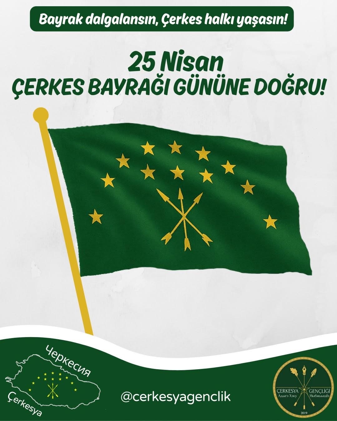 Bugünden itibaren, Çerkesya Gençlik olarak sosyal medya hesaplarımızdan her gün 25 Nisan’a kadar bayrağımıza dair paylaşımlar yapacağız!