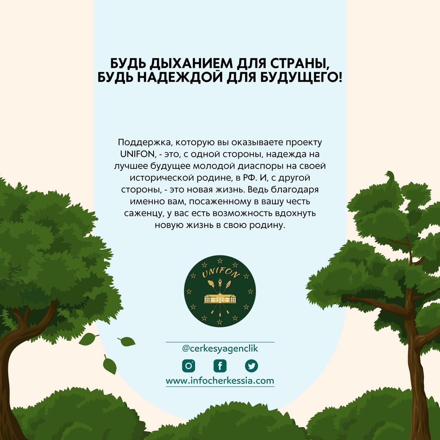 Поддержка, которую вы оказываете проекту UNIFON, - это, с одной стороны, надежда на лучшее будущее молодой диаспоры на своей исторической родине, в РФ. И, с другой стороны, - это новая жизнь. Ведь благодаря именно вам, посаженному в вашу честь саженцу, у вас есть возможность вдохнуть новую жизнь в свою родину.