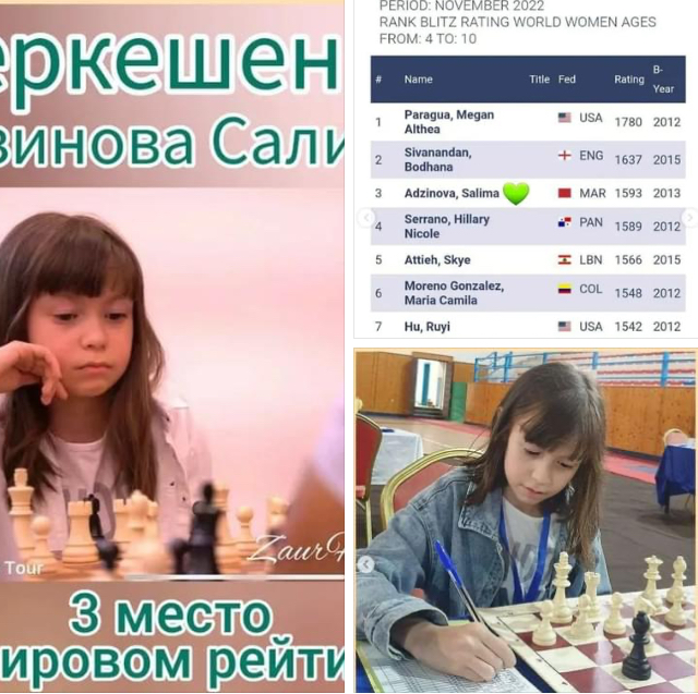 Adzinova Salima,10 yaşına kadar yaş kategorisinde dünya satranç sıralamasında üçüncü sırada yer alıyor. Salima, 9 yaşında bir Çerkes kızı ve ailesiyle birlikte Fas'ta yaşıyor.