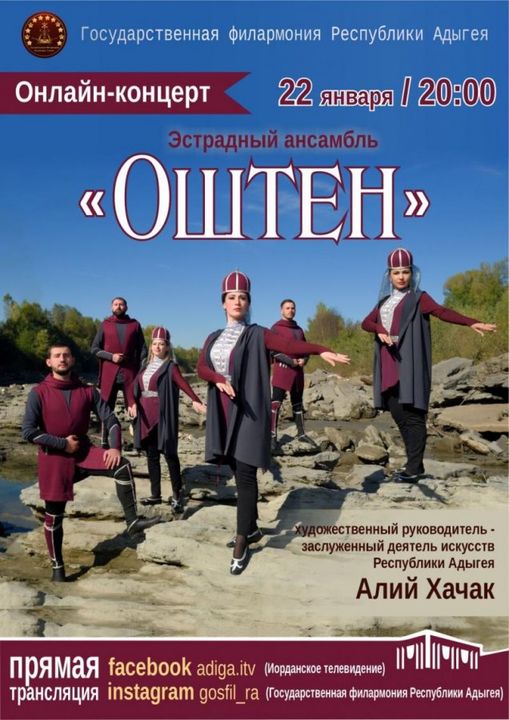 Adığe Cumhuriyeti Kültür Bakanlığı'ndan yapılan açıklamaya göre, Adığe Cumhuriyeti Devlet Filarmoni Derneği'nin Kültür ve Sanat topluluğu "Oshten"in ( Оштен ) gösterisi 22 Ocak'ta internet üzerinden gerçekleştirilecek.