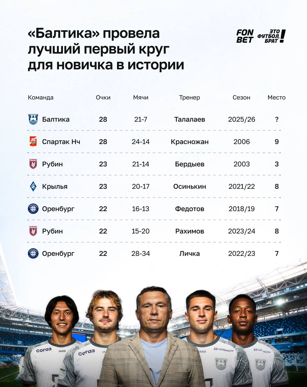Kaliningrad ekibi Baltika, lige yeni katılan bir takım için Rusya Futbol Şampiyonası tarihindeki en iyi ilk tur sonucunu elde etti. 15 maçta 28 puan toplayan takım, 21-7'lik averajla ikinci sırada yer aldı.