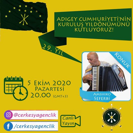 Adıgey Cumhuriyetimiz’in 29. Kuruluş Yıl Dönümü’nü Doğu Çerkesya'dan Usta Pşınawa, Kabardey-Balkar Cumhuriyeti Onur sanatçısı Amshiko Seferbi ile facebook ve instagramdan yapacağımız canlı yayınla kutluyoruz!