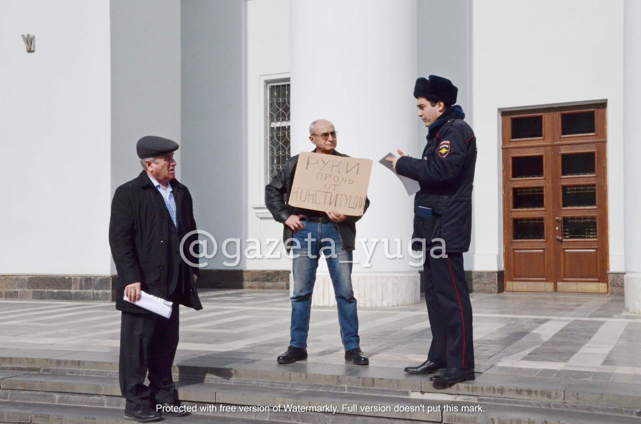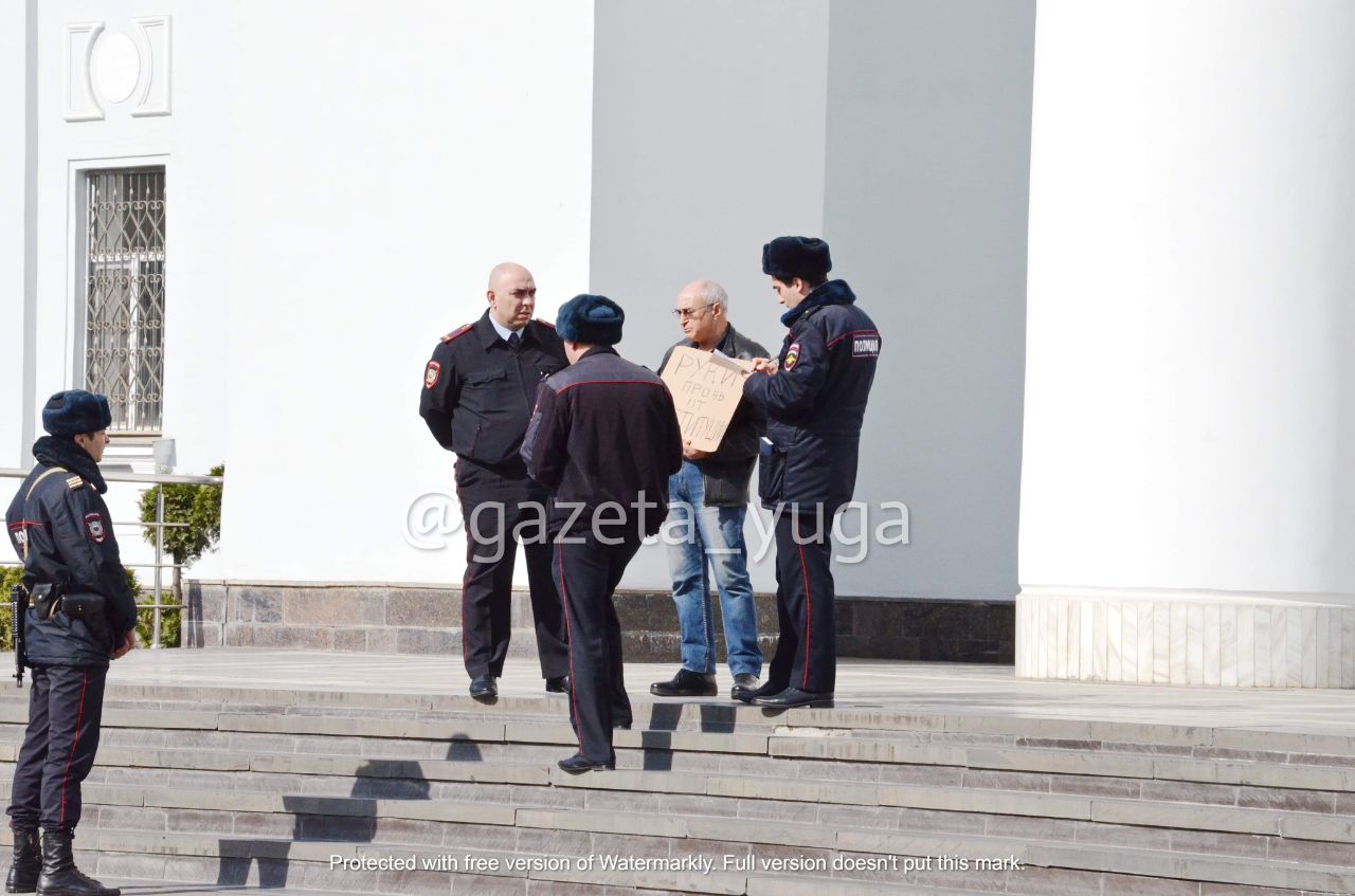 Nalçik'teki parlamento binası önünde Alik Shashaev ve Azamat Shormanov, anayasadaki yeni değişikliklere karşı tek kişilik eylemleri neticesinde göz altına alınarak polis merkezine götürüldüler.