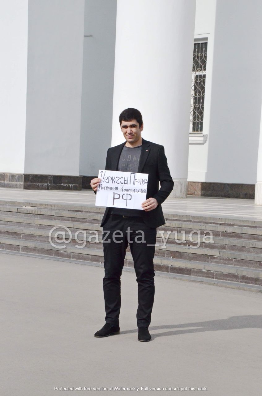 Xabze Xase üyesi Azamat Shormanov'un taşıdığı pankartta 'Çerkesler Rusya Federasyonu Anayasası Değişikliğine Karşı' ifadesi dikkat çekti. Azamat Shormanov'a ulaşan Nalçik temsilcimiz, ifadesi alınmak üzere mahkemeye götürüldüğünü bildirdi.
