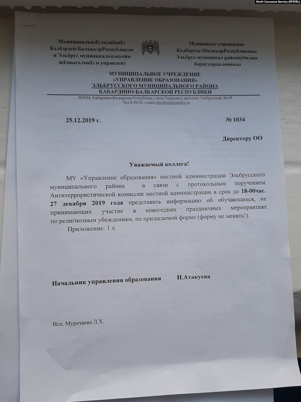 Kabardey-Balkarya'nın Elbrus bölgesinde ki yerel eğitim bölümü, dini inançları nedeniyle yeni yıl etkinliklerine katılmayı reddeden çocukların isim listesinin yapılması için okul yönetimlerine yazı gönderdi.