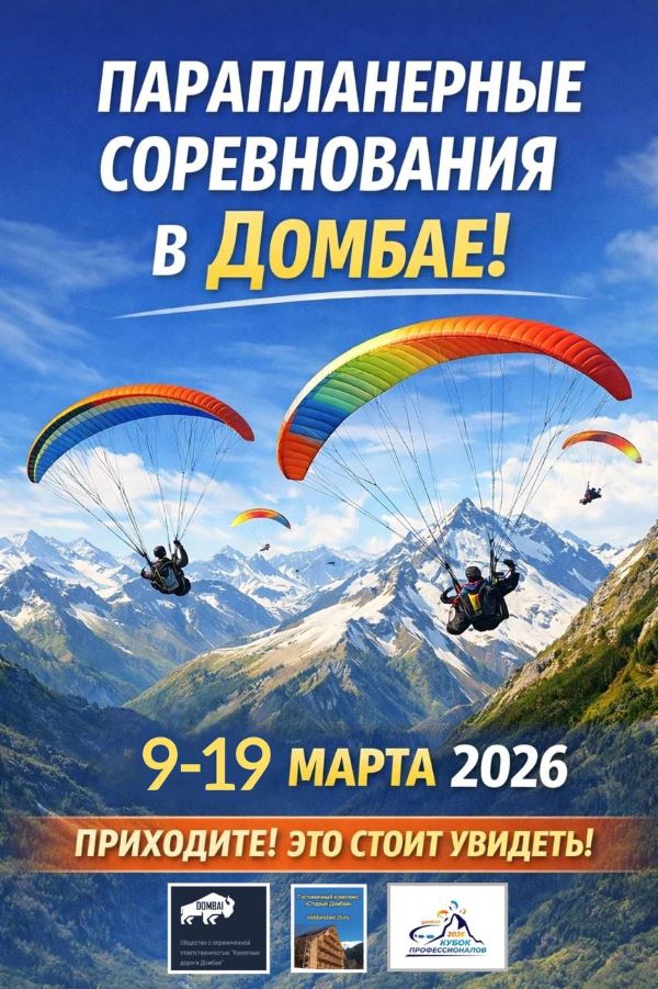 9-19 Mart tarihleri arasında Dombay'da yamaç paraşütü yarışmaları düzenlenecek. Karaçay-Çerkes Cumhuriyeti Turizm ve Tatil Beldeleri Bakanlığı'ndan yapılan açıklamada,