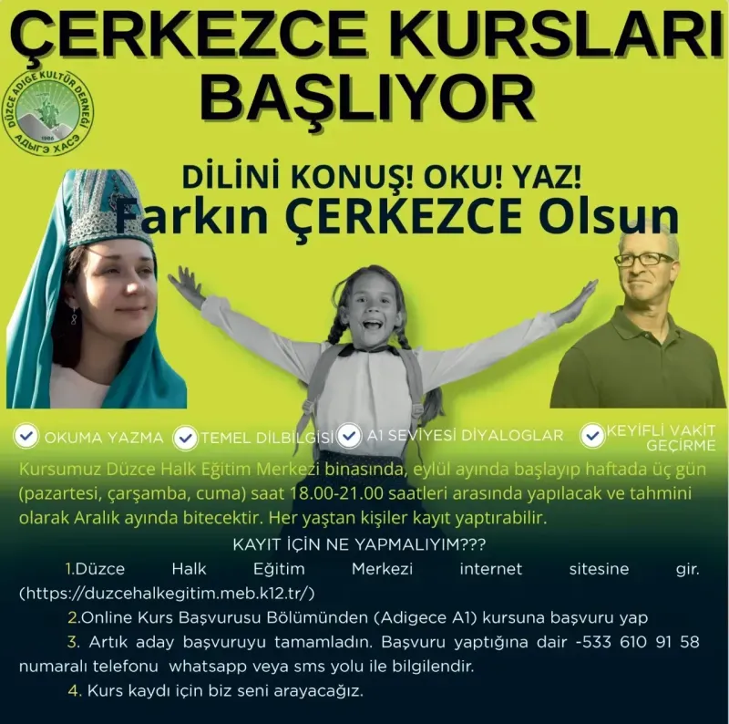 Düzce Adıge Kültür Derneği ve Halk Eğitim Merkezi iş birliğiyle Çerkezce kursları eylül ayında başlıyor. Her yaş grubuna açık olan kurslarla hem dil öğrenilecek hem de kültürel bağlar güçlenecek.