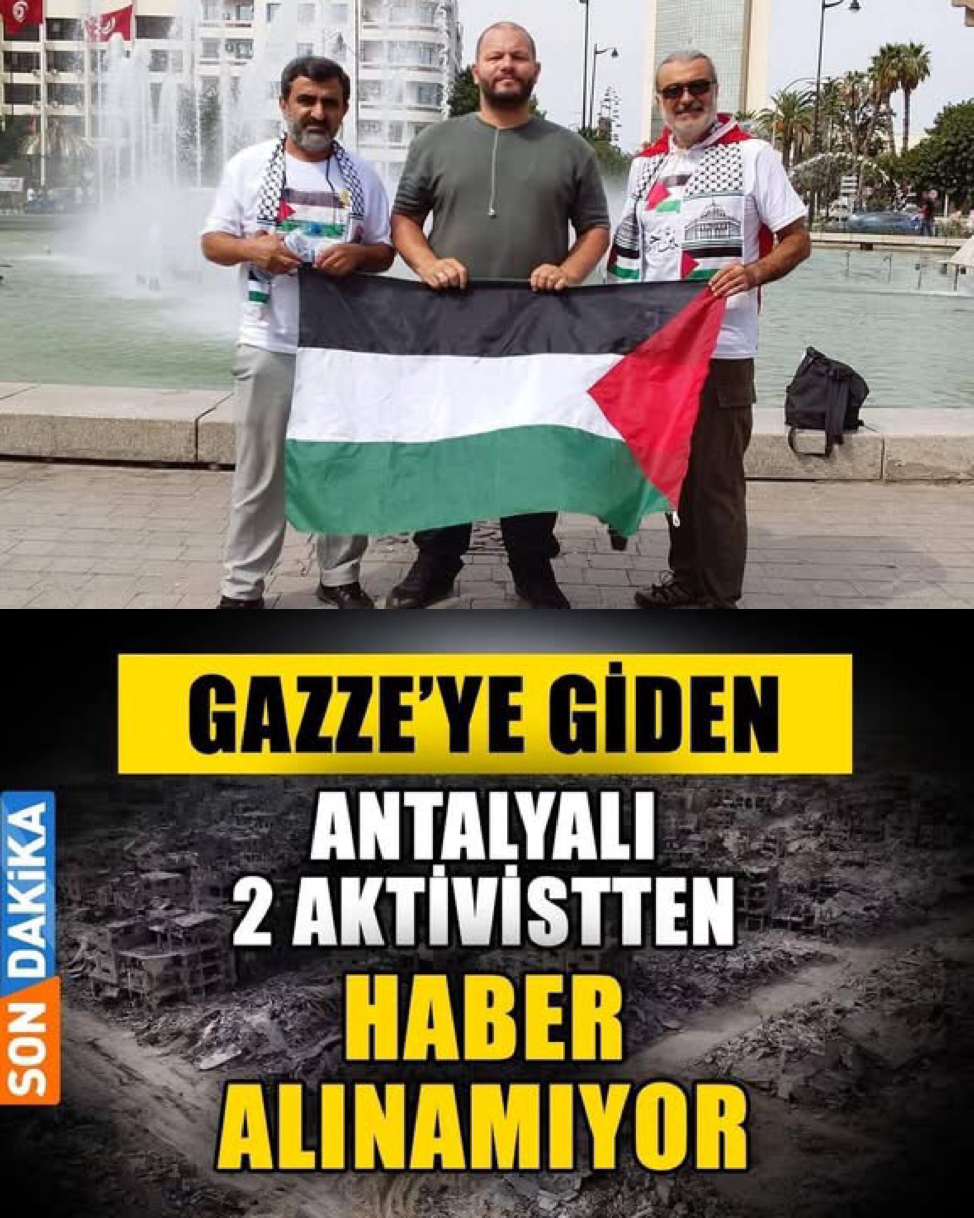 İşgalci İsrail ablukasını kırmak ve işgal altında olan Gazze’ye insani yardım ulaştırmak için yolan çıkan Küresel Sumud Filosu, Akdeniz’de işgalci İsrail’in sert müdahalesine maruz kaldı. Gelen son bilgileri göre filoda bulunan aktivistlere müdahale sürerken filoda bulunan Antalyalı aktivistler Hakan Şimşek ve Alpaslan Arslan’dan haber alınamıyor. Antalya’nın aktivistlerin sağlık durumları ise belirsizliğini koruyor.