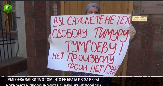 Saratow hapishanesinde yatan Vladikavkaz'lı bir mahkum Timur Tumgoev'in kız kardeşi, tek kişilik bir eylemle erkek kardeşinin hapishanede işkence gördüğünü yetkililere duyurmaya çalışıyor.
