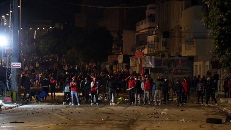 Başkent Tunus'ta Pazartesi gecesi çoğunluğunu gençlerin oluşturduğu göstericiler güvenlik güçlerine taş ve molotof kokteyli attı. Polis ise göstericilere tazyikli su ve biber gazıyla yanıt verdi.