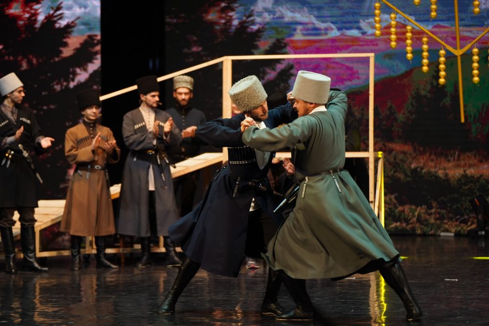 Adigey Halk Sanatçısı Mihail Arzumanov yönetimindeki tiyatro sanatçılarının seslendirdiği koro parçaları ve Baste Asiyet yönetimindeki folklor topluluğu "Aşemez" ile eylem duygusal bir boyuta taşınıyor.