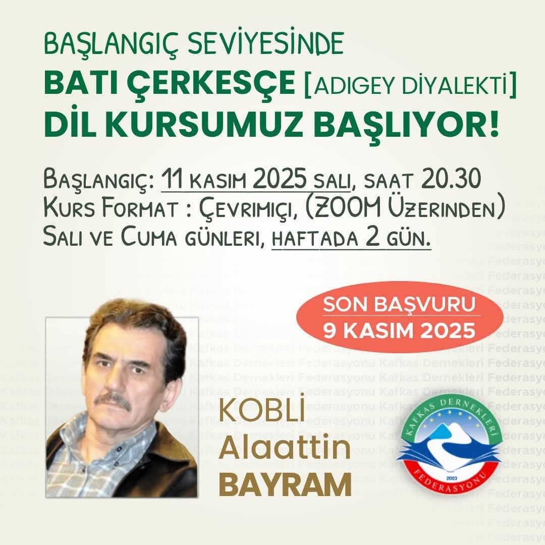 Kafkas Dernekleri Federasyonu (KAFFED) tarafından çevrimiçi olarak düzenlenen Başlangıç Seviyesinde Çerkesçe (Batı Diyalekti) dil kursumuz, değerli hocamız KOBLİ Alaattin BAYRAM tarafından verilecek derslerle 11 Kasım 2025 SALI günü başlıyor.