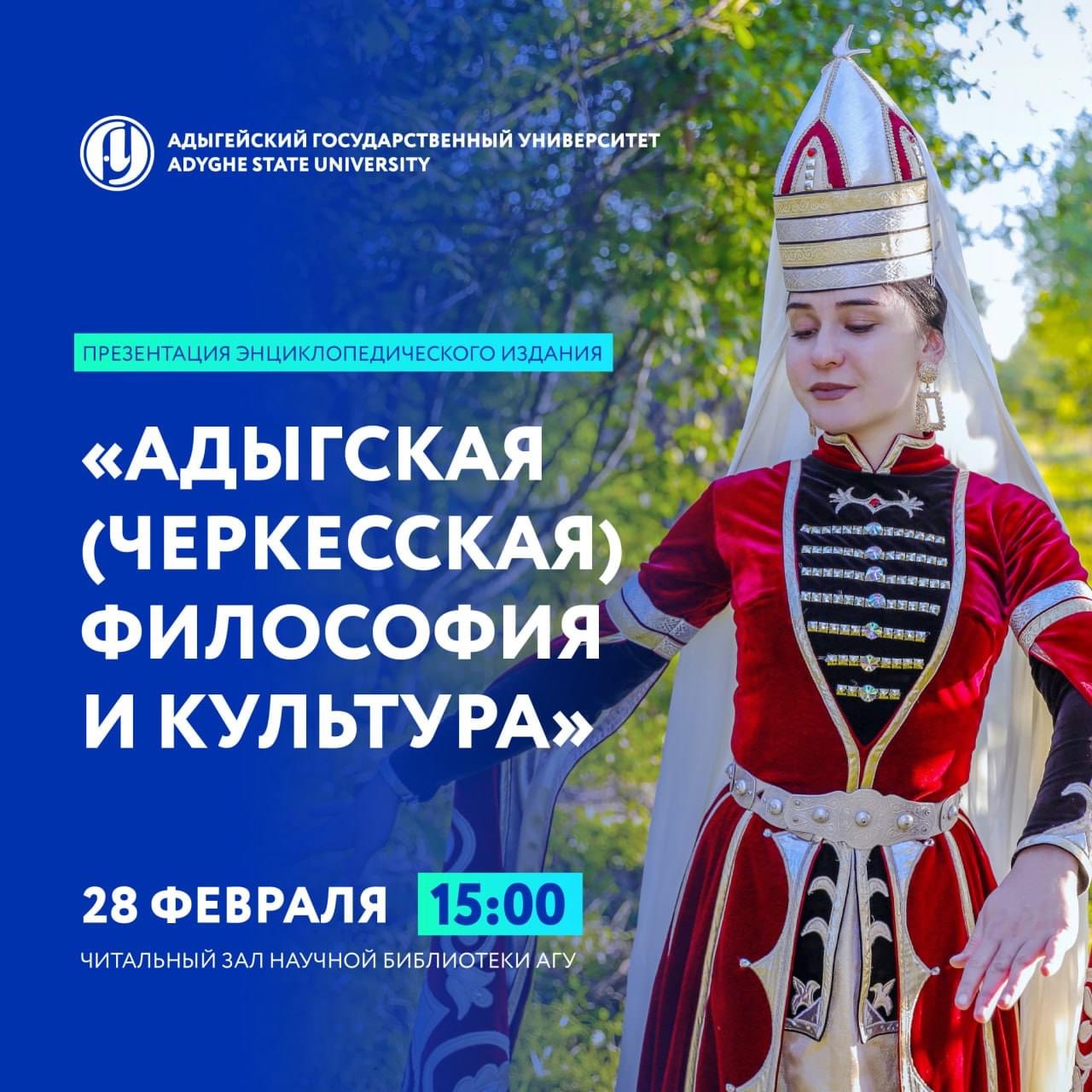 Сегодня, 28 февраля, в 15:00 в читальном зале Научной библиотеки Адыгейского государственного университета состоится презентация энциклопедического издания «Адыгская (черкесская) философия и культура».