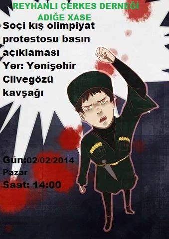 Reyhanlı Çerkes Derneği-Adığe Khase, Soçi Kış Olimpiyatlarını protesto etmek için, 2 Şubat 2014 günü, saat 14:00’da kitlesel bir basın açıklaması düzenliyor.