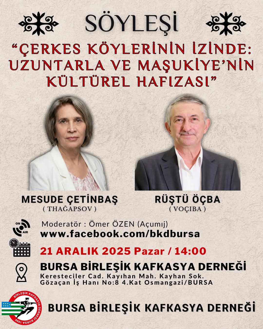 Bursa Birleşik Kafkasya Derneği olarak, Çerkes kültür mirasına ışık tutan değerli konuklarımızla gerçekleştireceğimiz özel bir programa sizleri davet ediyoruz.